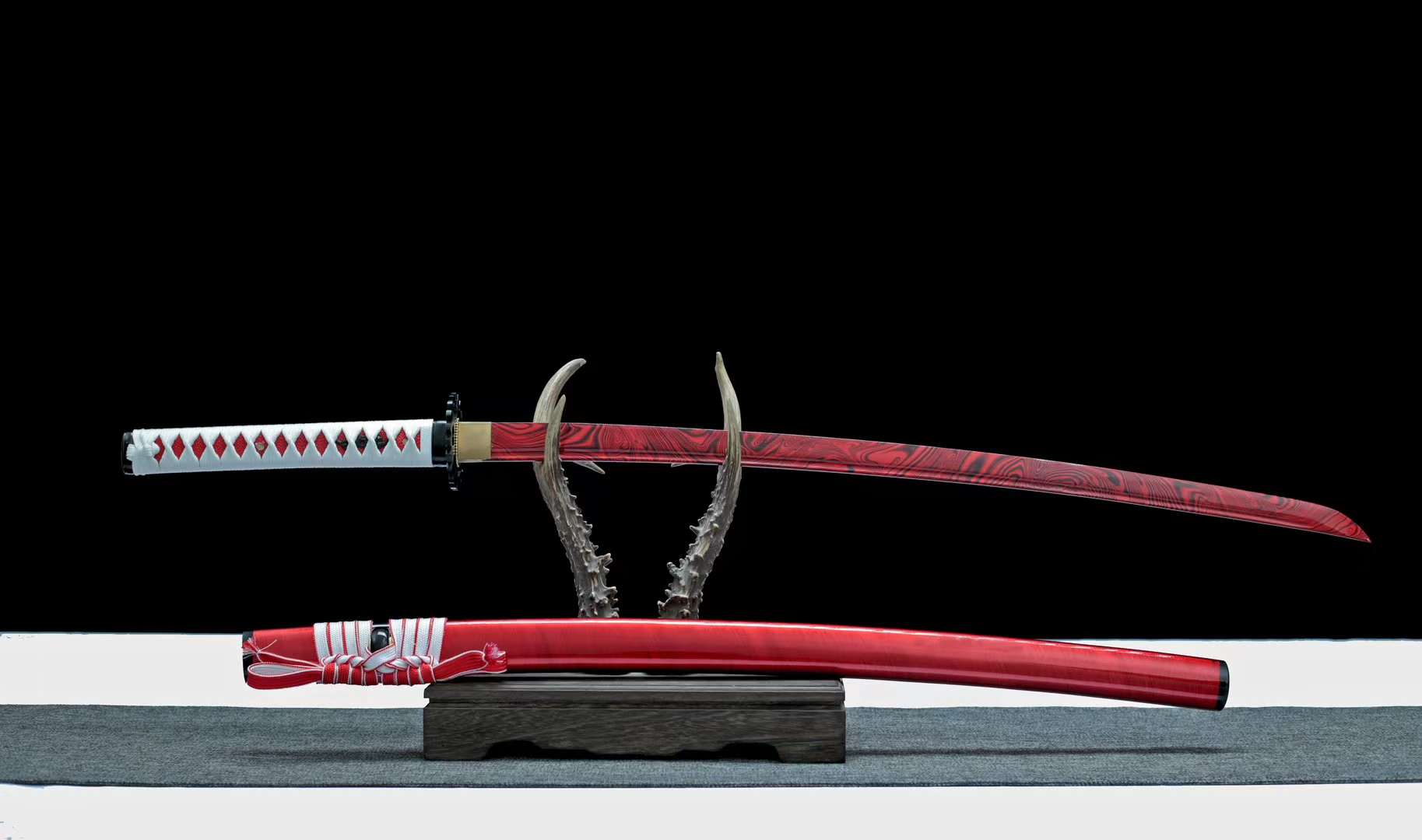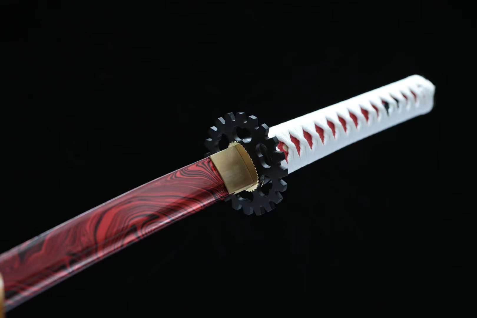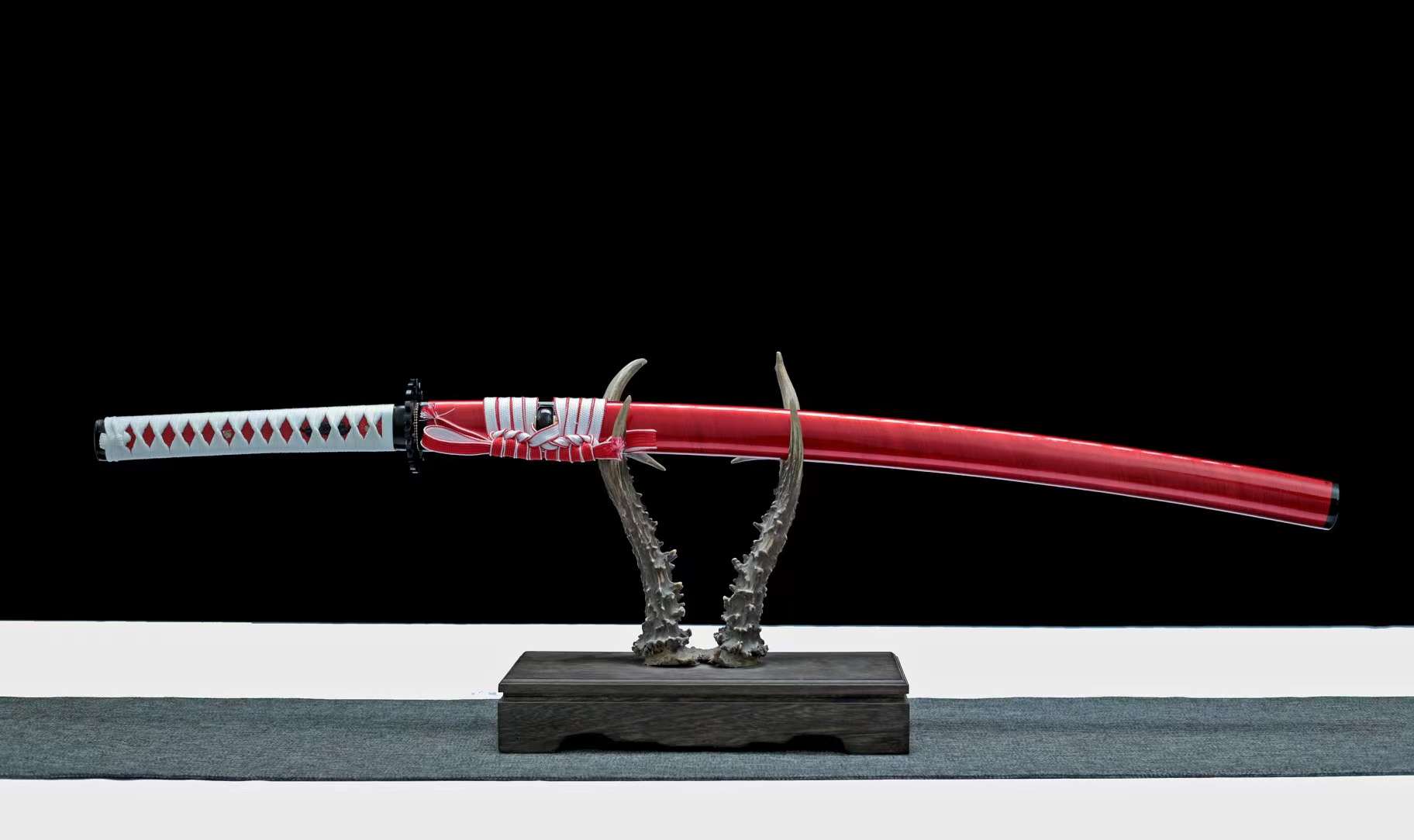 Scabbard (Saya 鞘): The lacquered red saya completes the composition, tied with a matching white-and-red sageo cord that enhances the katana’s vibrant aesthetic.