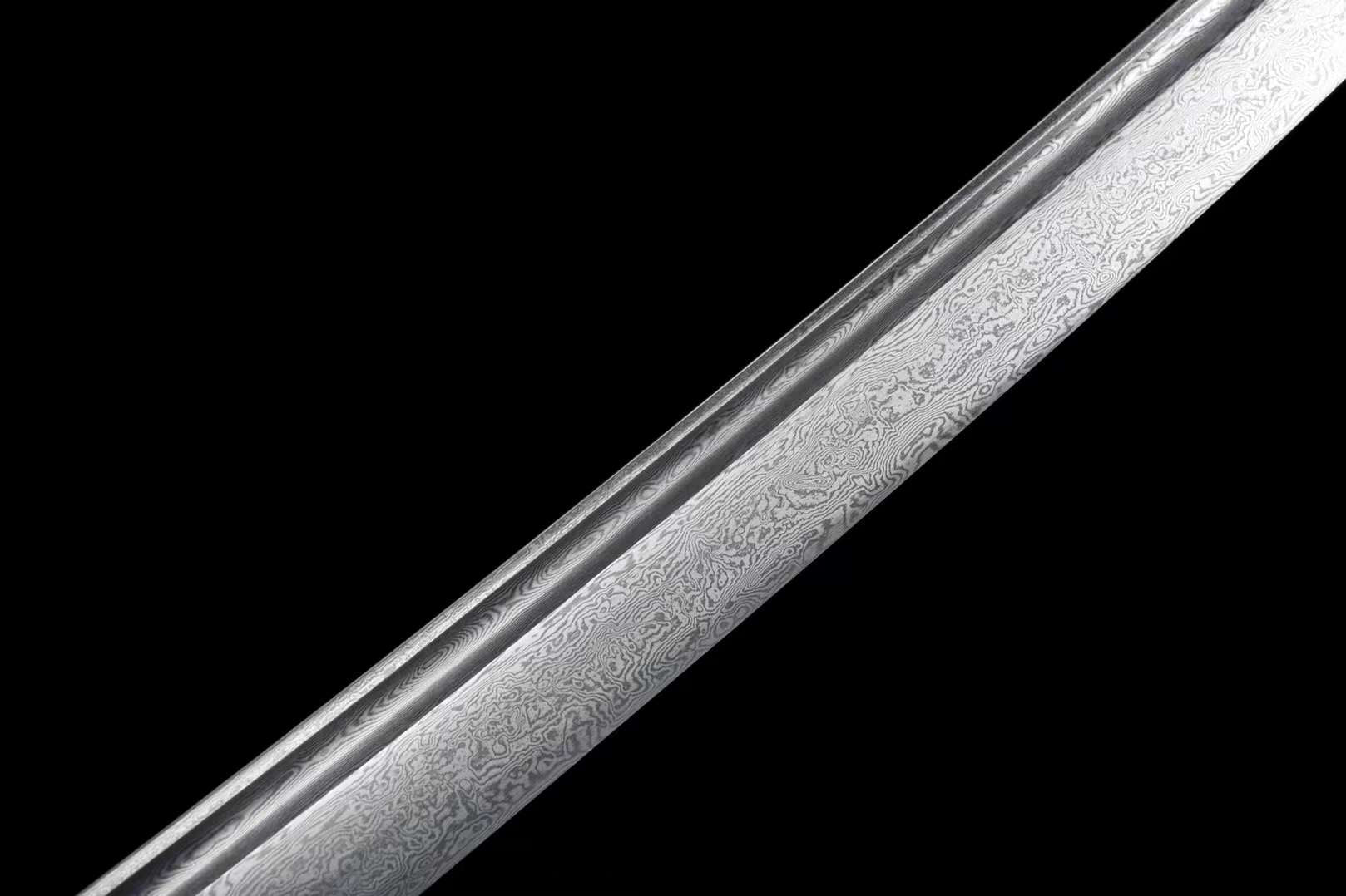 Blade (刀身): Forged from Damascus steel, the blade displays intricate wave-like patterns that catch the light beautifully, offering both strength and visual artistry.