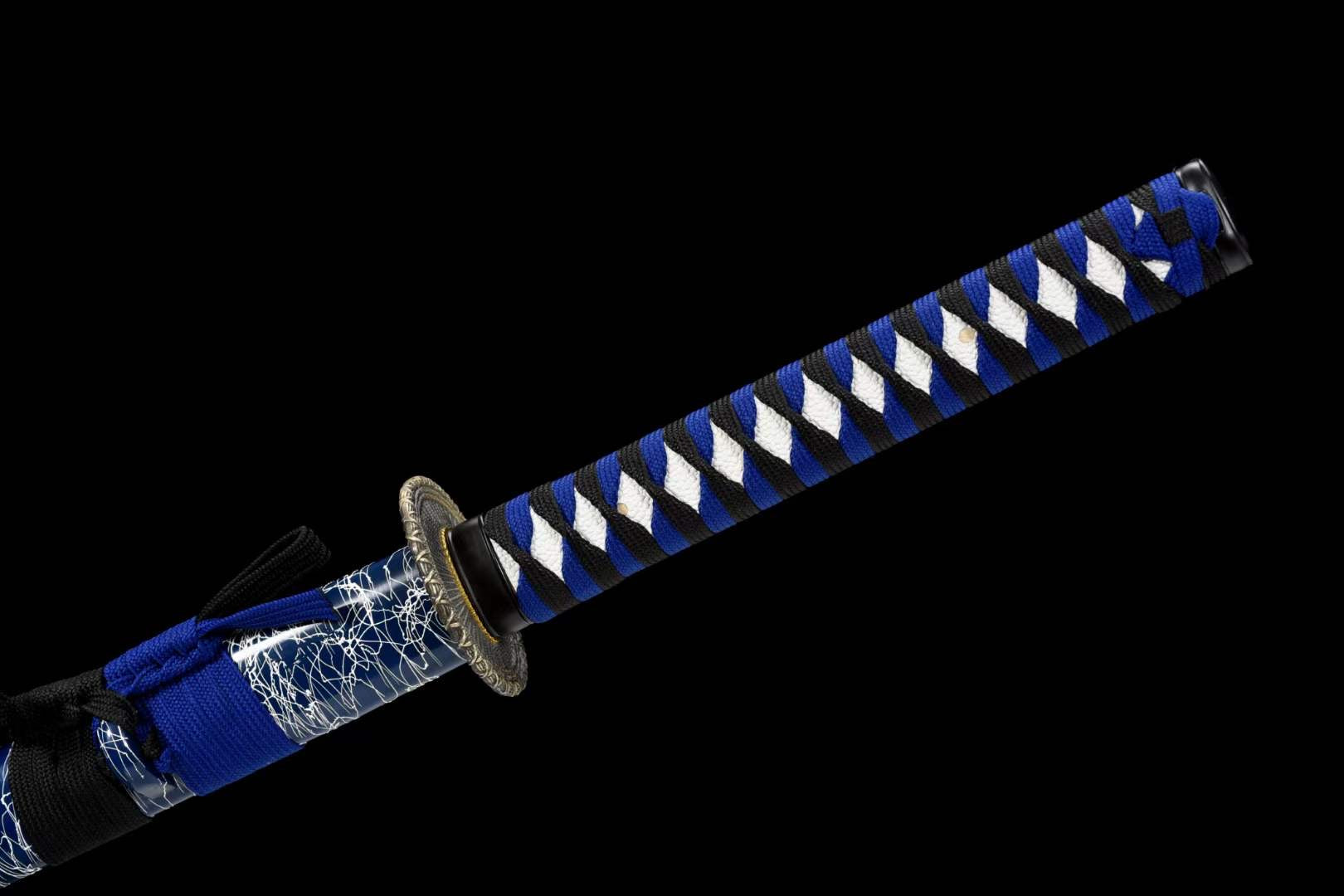 Scabbard (Saya 鞘) — With its blue lacquer finish and white marble texture, the saya gives the sword a modern yet traditional Japanese touch.