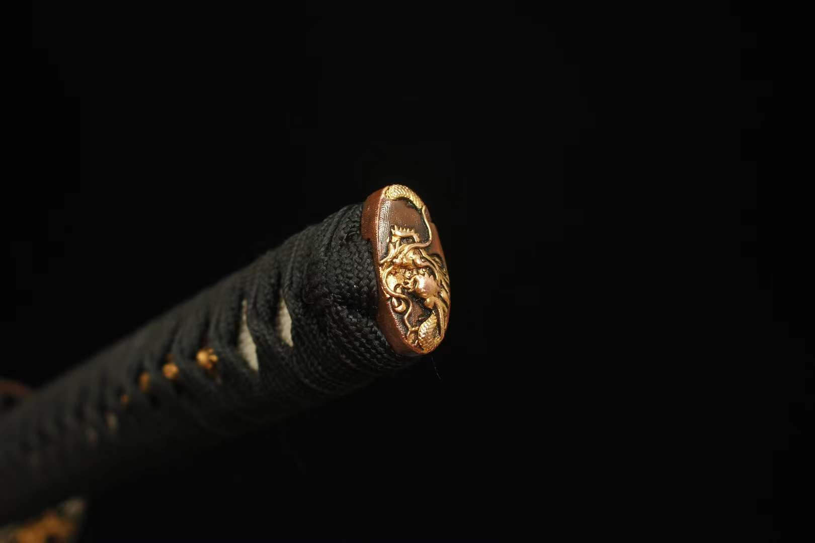 Handle (Tsuka 柄): Wrapped in premium black silk over genuine ray skin, the tsuka ensures an authentic grip and comfort, adorned with golden dragon menuki symbolizing protection and wisdom.