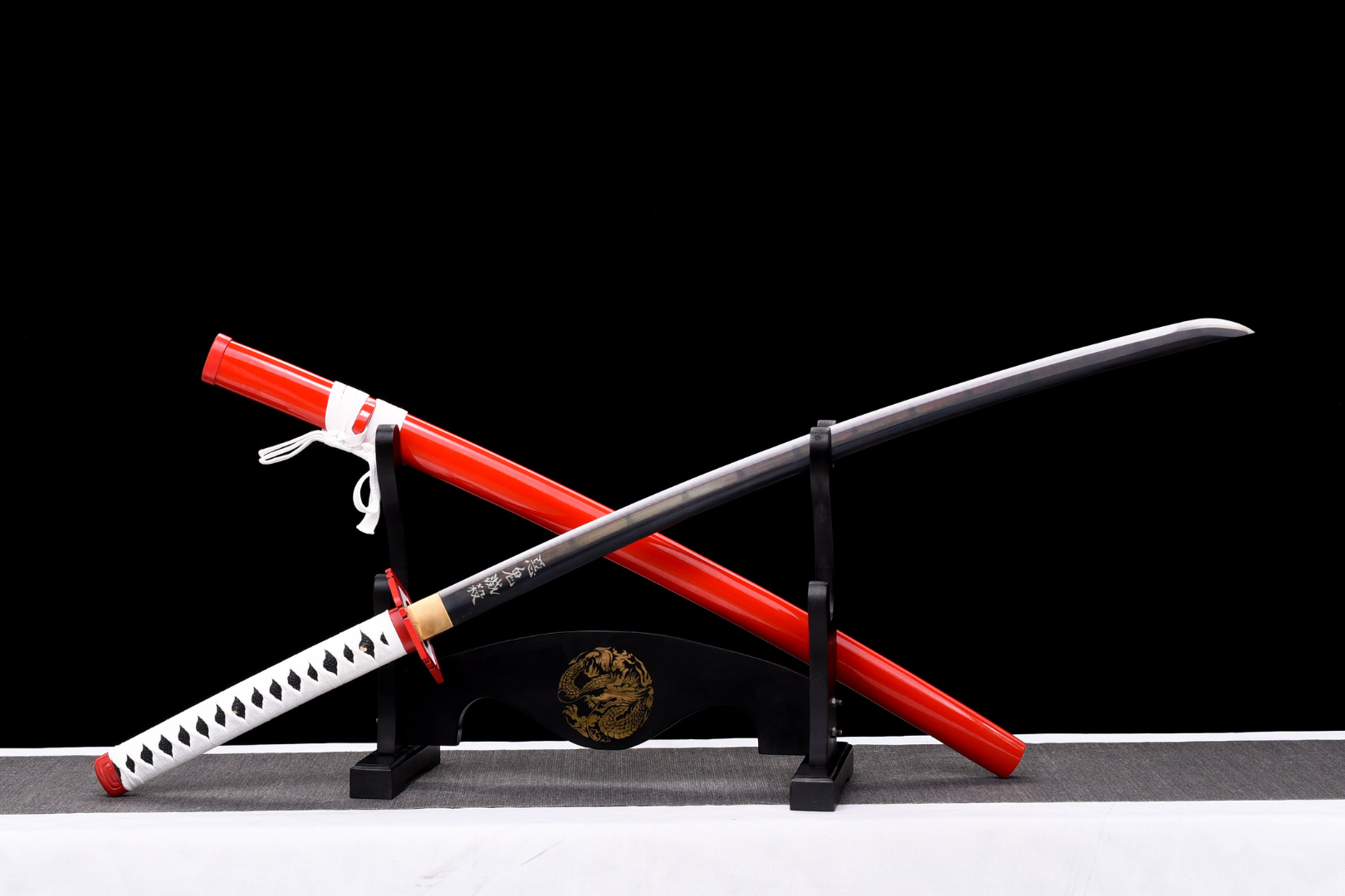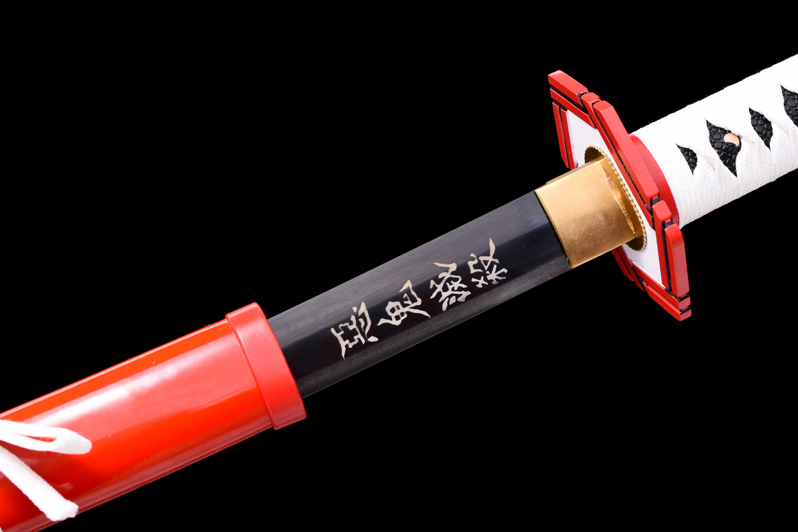 Discover the replica of Giyu Tomioka's famous katana, an exceptional katana with a captivating design. The 1060 carbon steel blade is sharpened and engraved with kanji, reinforcing its authenticity. The sculpted iron guard perfectly complements the traditional aesthetics of this katana. The red lacquered wooden scabbard is a real eye-catcher, while the black stingray leather handle is wrapped in white cord for optimum grip.