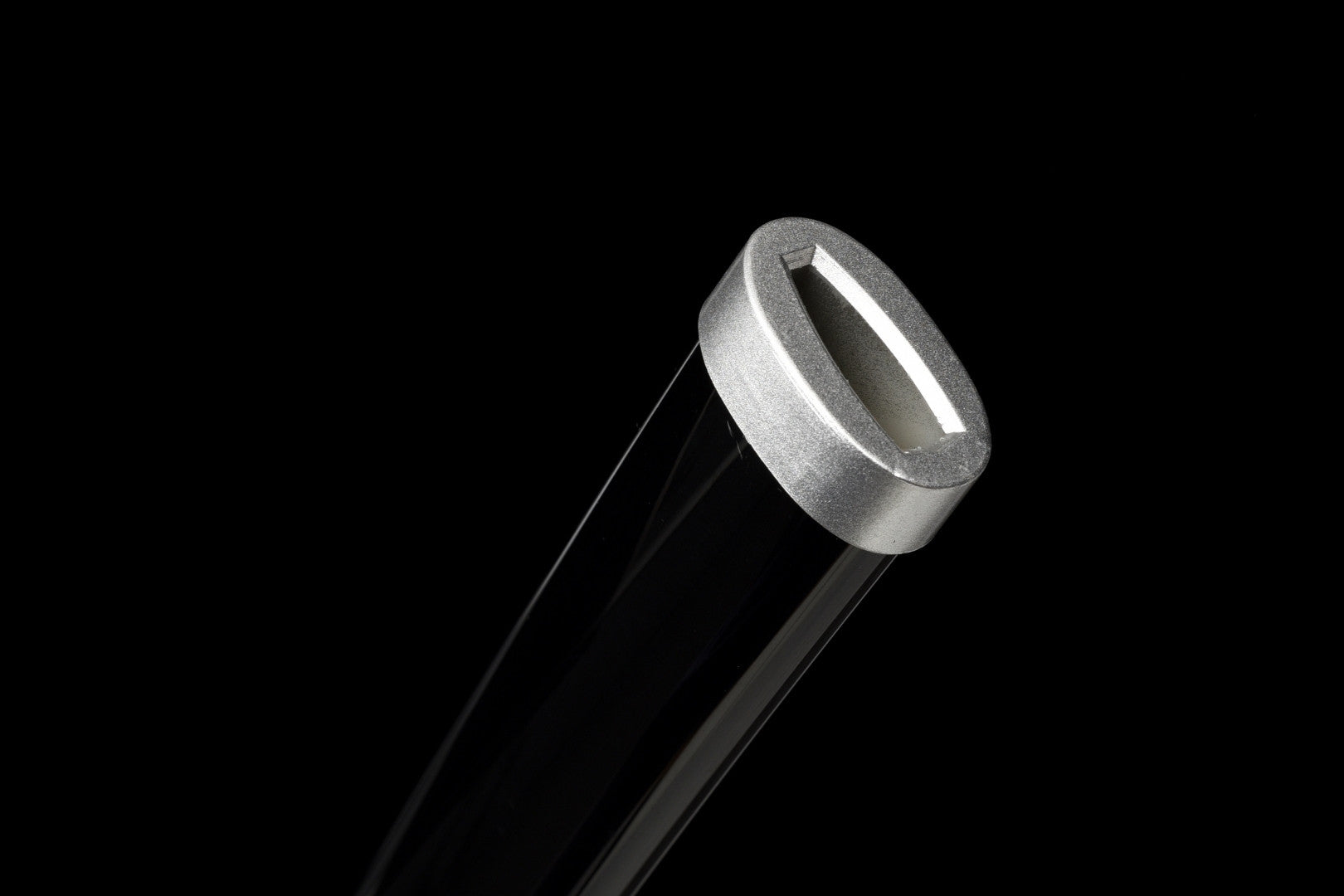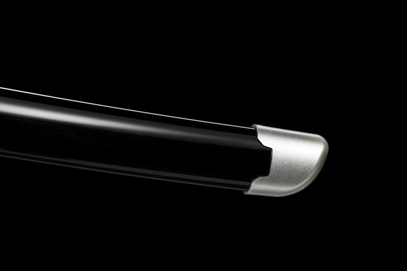 Scabbard (Saya 鞘) — The glossy black saya with silver fittings provides a sleek, durable protection for the blade.