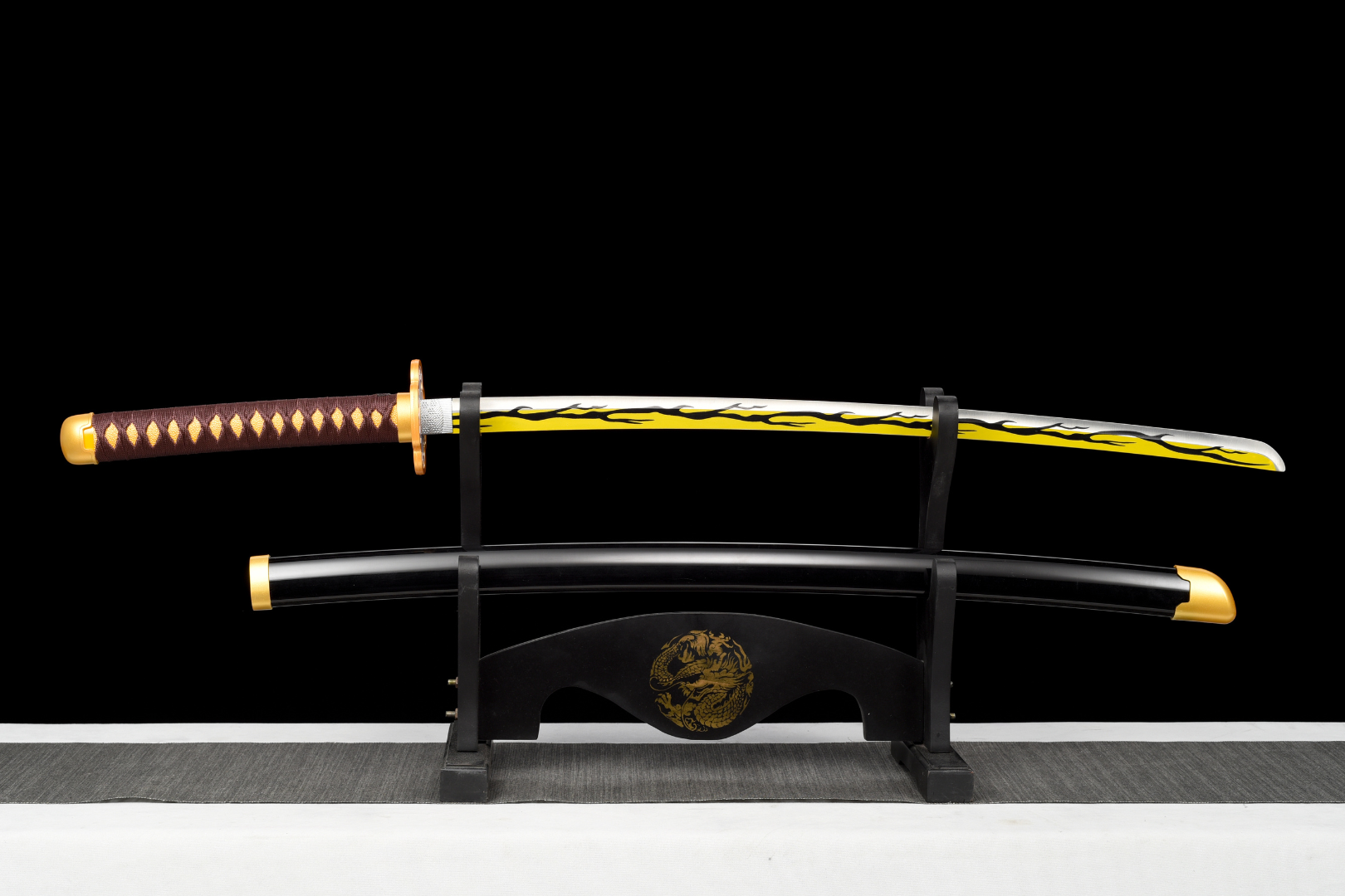 Blade (Kissaki 刃) — Forged from 1060 carbon steel, this bright yellow blade with black flame motifs reflects Zenitsu’s Thunder Breathing style and his explosive power.