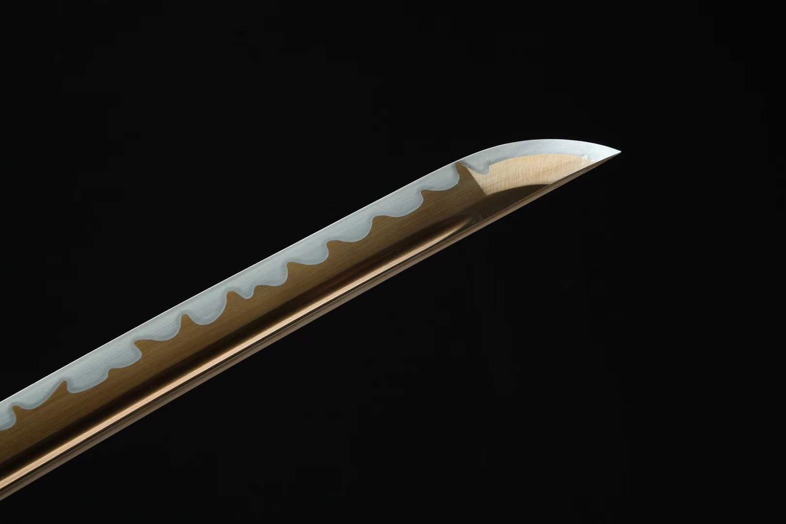 Blade (刀身): Hand-forged from folded steel, oil-quenched, and gold-tempered to reveal a vibrant hamon. Balanced for precision and strength.