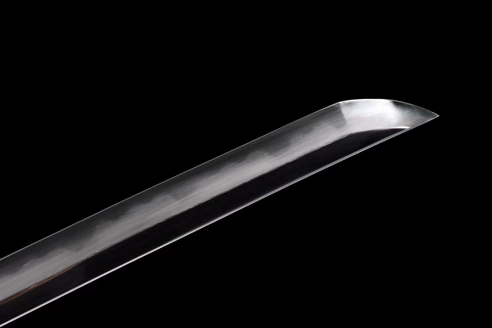Blade (刀身): Hand-forged Damascus with exquisite wave patterns and a refined hamon line, representing the dual nature of calm and strength.