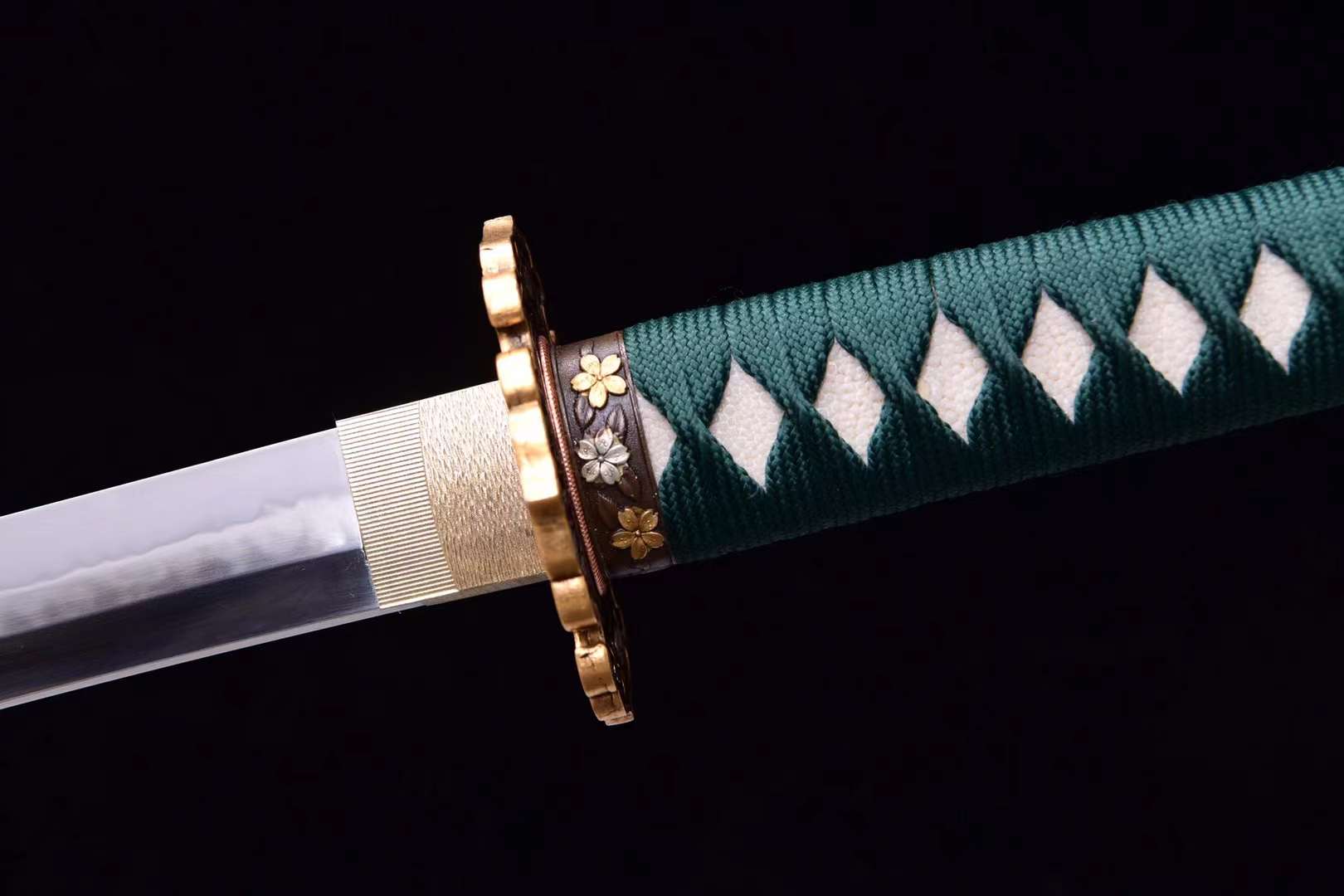 Handle (Tsuka 柄): Wrapped in emerald-green silk ito over genuine white ray skin, the handle ensures a comfortable, authentic grip and reflects the harmony of color found in Japanese artistry.