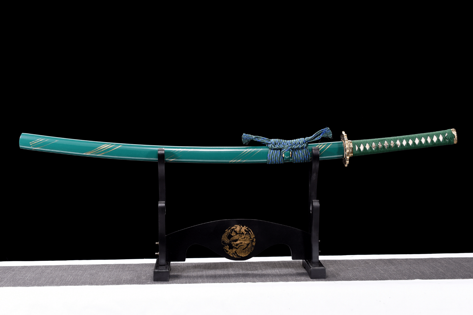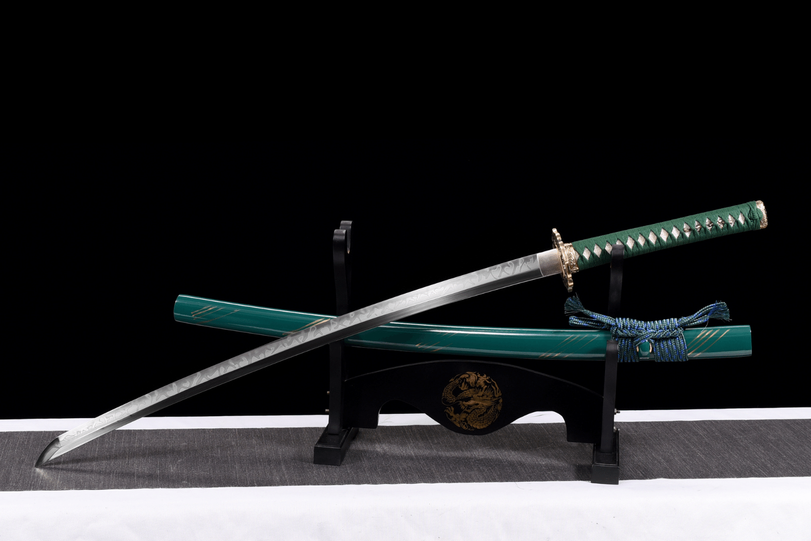 The Ryokuryū Katana (緑龍の刀), or “Green Dragon Blade,” captures the essence of balance between nature’s calm and a warrior’s power. Its vivid green theme and claw-pattern hamon symbolize both vitality and ferocity — the spirit of a dragon bound in steel.