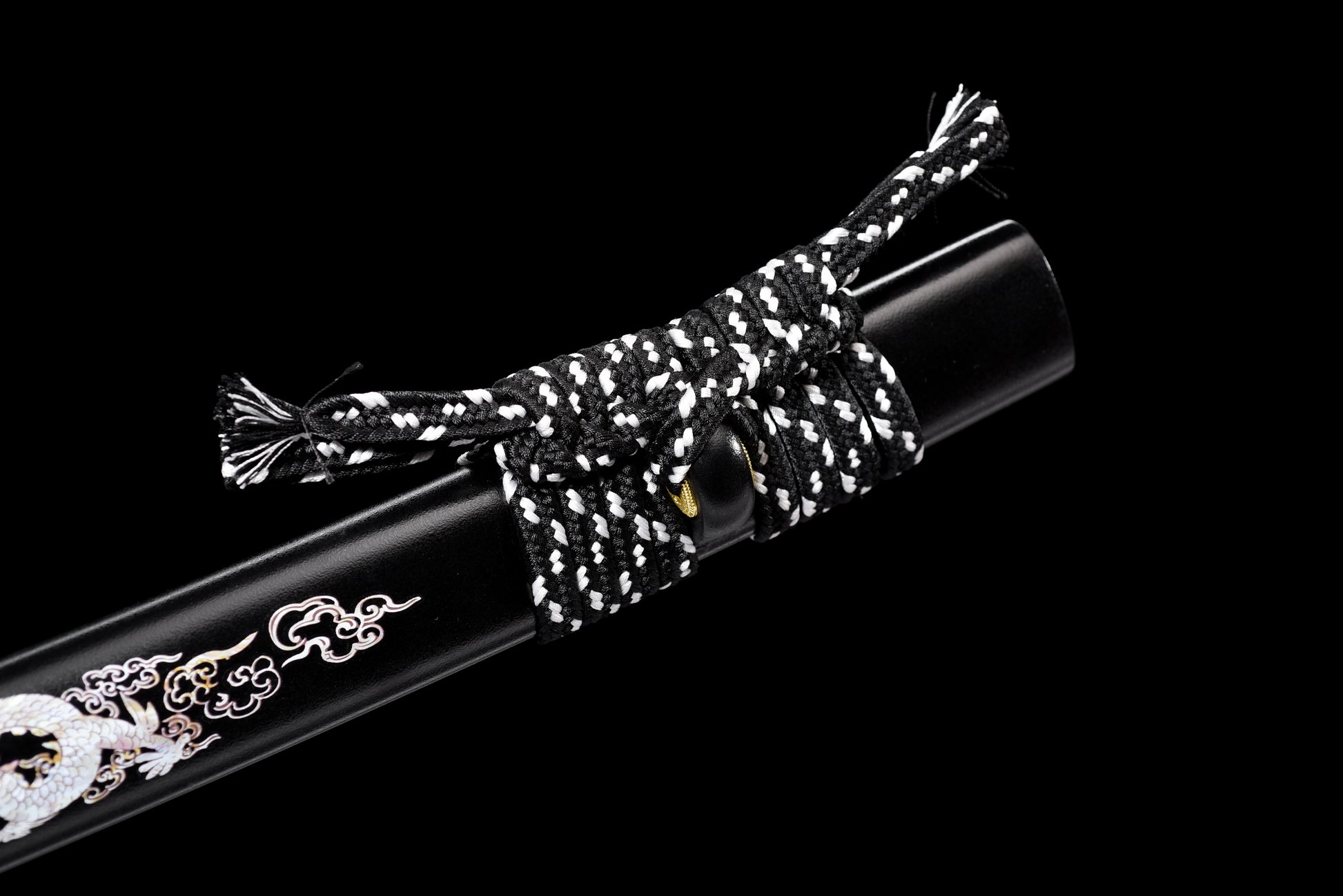 Scabbard (Saya 鞘): The glossy black saya is adorned with a silver dragon inlaid by hand, its scales shimmering under light. The black-and-white sageo cord ties the design together in a timeless contrast.