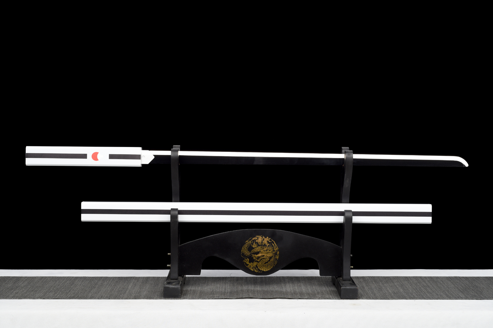 Scabbard (Saya 鞘) — White lacquered with twin black lines and the iconic red Uchiha clan emblem, representing pride and vengeance.