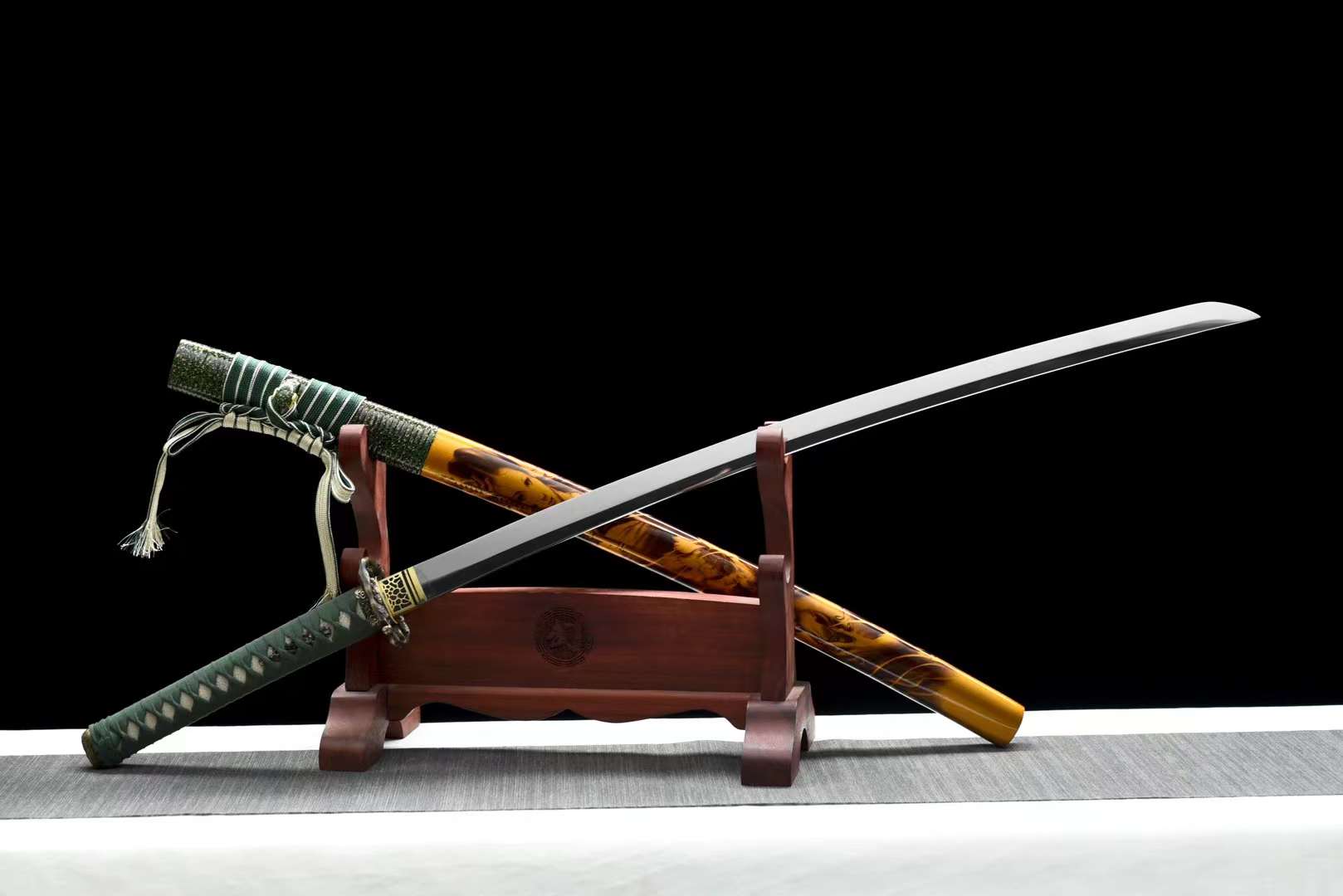 The Shizuhime Katana (静姫 – “Princess of Serenity”) captures the grace and poise of a noble woman from feudal Japan. Its reflective blade symbolizes purity, while the golden saya adorned with a painted portrait makes it a true collector’s masterpiece — elegant, powerful, and timeless.