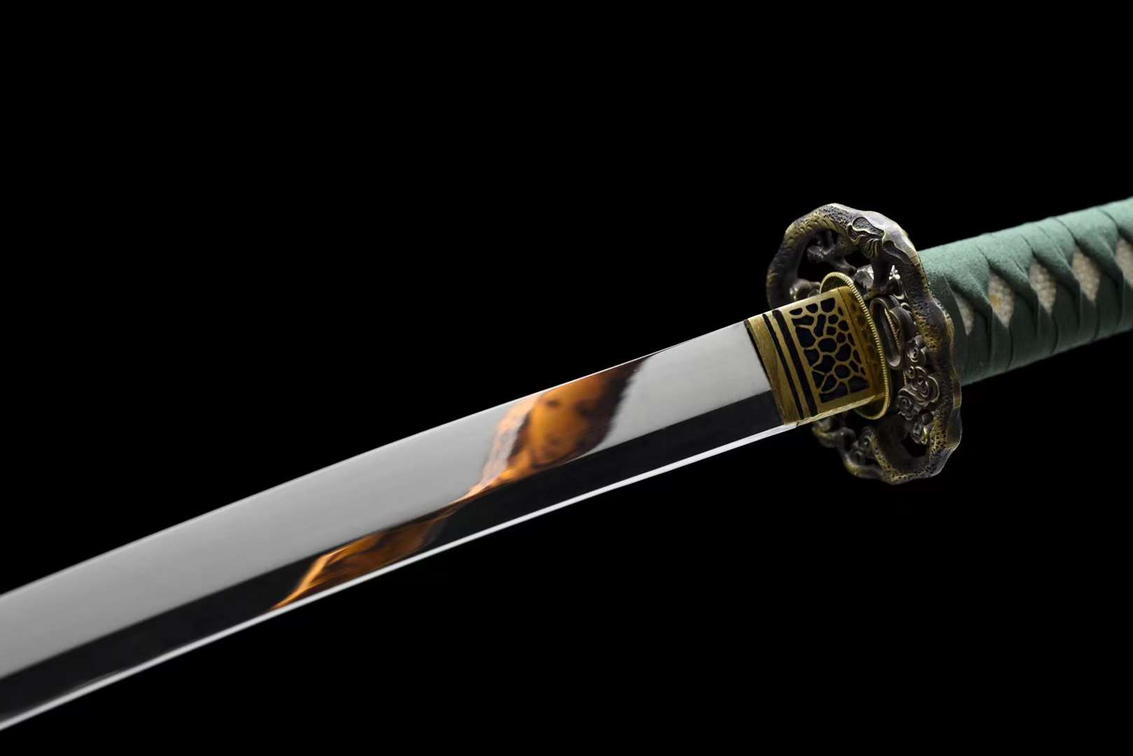 Handle (Tsuka 柄) Green silk wrap over white rayskin, traditional Japanese pattern