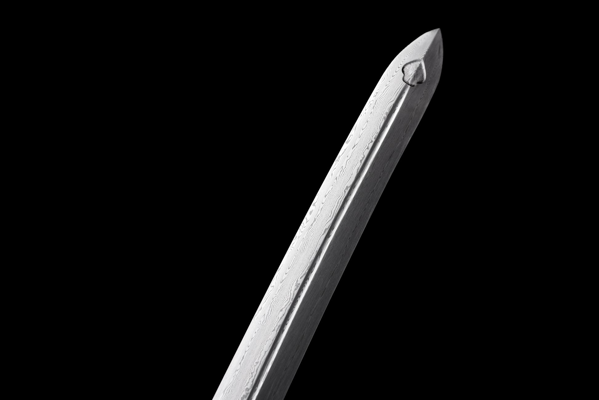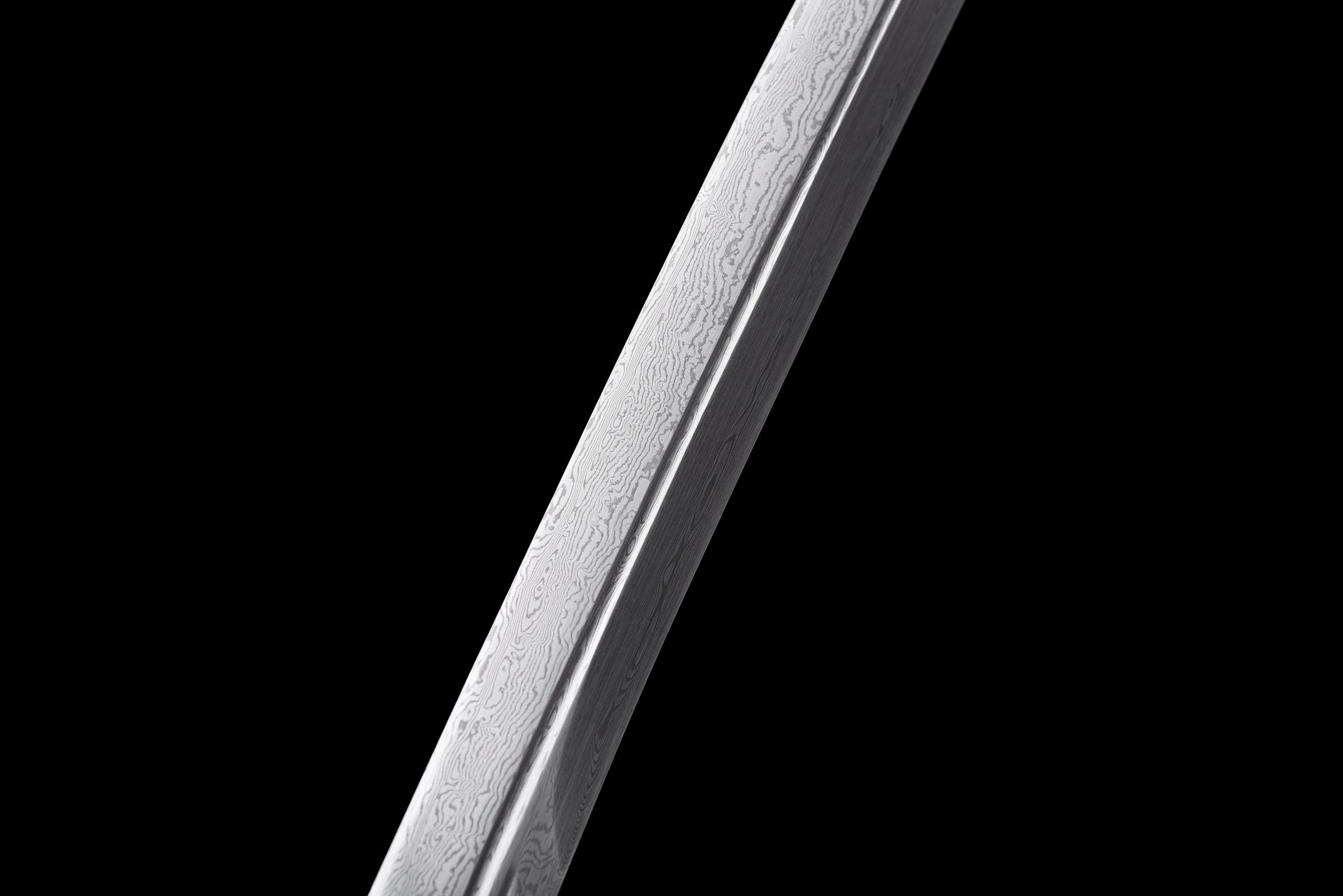 Blade (刀身): Forged from Damascus steel, the blade reveals a hypnotic wave pattern along its surface — a hallmark of mastery and resilience. Its polished edge ensures both beauty and lethal precision.